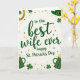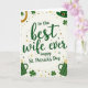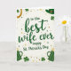 This card features a St. Patrick’s Day layout on a soft off-white background, with the main message centered in rich green lettering 💚. The phrase “to the best wife ever” stretches across the middle in a flowing style, and “happy St. Patrick’s Day” sits nearby in a simpler, sharper font, all in matching shades of green. The wording feels affectionate, like it’s meant for someone you’d toast with and lean close to during a lively celebration. Near the top, small shamrocks and a green leprechaun hat with a gold buckle add charm, alongside a golden horseshoe that catches the eye ☘️. The greens range from deep emerald to lighter leaf tones, while the gold accents add warm contrast without overpowering the page. At the bottom, two green beer mugs sit side by side with creamy golden foam, suggesting a shared drink and an easy closeness. Tiny green-and-gold speckles are scattered around like confetti, filling the open space with little points of color.