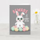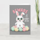 This design shows a minimalist gray background with a stylized white rabbit centered up front, its pink inner ears, rosy cheeks, and soft paw pads giving it a sweet look 🐰. The rabbit’s narrowed green eyes and slightly raised brow create a teasing, “don’t underestimate me” stare, like it’s daring a close friend to step closer. A tiny fang peeks out at the corner of its mouth, adding a mischievous edge, while a black “X” sits on its belly as a cheeky mark. At the rabbit’s feet, several oval eggs form a loose cluster, decorated with simple stripes in pastel mint, pale yellow, and blush pink 🌷. Near the top, the word “BEWARE” curves in rounded pink letters, drawing attention first. Beneath it, “OF THE BUNNY KICKS” appears in stacked white text, centered and easy to read against the gray. The overall layout keeps the rabbit and eggs anchored in the middle, with the warning text hovering above in a neat, balanced arrangement.