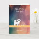 Birthday card for a Lhasa Apso Dog standing on a yellow bar with a designer, colorful background, and an illustrated dog bone. Thanks to the Hungryjpeg for some of the elements in the design. Larger print on this copy.