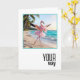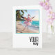 A flamingo dances while wearing a pink tutu and a feathered boa as it stands on a sandy beach, with a turquoise ocean and palm trees forming a tropical backdrop.