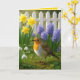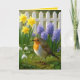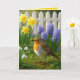 Robin is standing in a garden with spring daffodils, snowdrops, and purple hyacinth flowering plants, with a white wooden picket fence