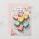 Nous vous présentons notre charmante carte de vœux plate personnalisable, parfaite pour envoyer des messages sincères à vos proches. Le recto de la carte présente un design charmant avec sept cookies en forme de cœur magnifiquement décorés de couleurs pastel, disposés selon un motif visuellement agréable. Chaque cookie est orné de détails de glaçage complexes, ajoutant une touche d'élégance et de douceur à la carte. Le texte sur le devant indique "Sweet Wishes for a Lovely Day !" (Vœux doux pour une journée merveilleuse !) dans une police élégante de style écriture à la main, complétant parfaitement le design fantaisiste.
