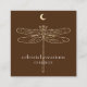 Le carte de visite carré moderne présente une libellule céleste dorée avec illustration lune en croissant sur un arrière - plan brun foncé avec un texte contemporain blanc sur l'avant, et un texte gris avec un code QR personnalisable pour votre site Web ou les médias sociaux sur l'arrière.