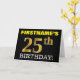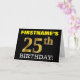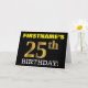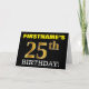 Ce design de carte de voeux d’anniversaire comporte un message comme "FIRSTNAME’S 25th BIRTHDAY!", le "25th" ayant une apparence de couleur fausse/imitation or. Le nom du destinataire sur le devant peut être customisé, et l’arrière - plan avant est de couleur noire. Il comporte également un message de voeux d'anniversaire personnalisable à l'intérieur. Une carte de voeux comme celle-ci pourrait peut-être être remise à quelqu'un pour célébrer son vingt-cinquième anniversaire. [~Z0000183]