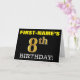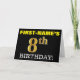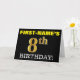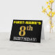 Ce design de carte de voeux d’anniversaire comporte un message comme "FIRST-NAME’S 8th BIRTHDAY!", avec le "8th" ayant une apparence de couleur fausse/imitation or. Le nom du destinataire sur le devant peut être customisé, et l’arrière - plan avant est de couleur noire. Il comporte également un message de voeux d'anniversaire personnalisable à l'intérieur. Une carte de voeux comme celle-ci pourrait peut-être être remise à quelqu'un pour célébrer son huitième anniversaire. [~Z0000183]