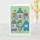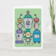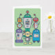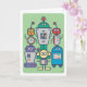 Les robots sont là ! Encourager une passion pour la science. Illustration amusante de 6 robots aux formes, couleurs et regards différents. Cette carte est une image numérique de papier peint à la main. Les couleurs comprennent ardoise foncée, vert menthe, marguerite rose, bleu ciel clair, cartons brun, or brillant, parchemin, chardon pourpre, rouge, lierre bleu, brosse à sagebrush violet, blanc fantôme, orange foncé, vert terre et argent. Intérieur : Vide pour toutes les occasions.