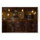 L'intérieur d'un bar élégant avec bar en teck, tabourets de bar, lampes pendentifs et une tour d'alcool.