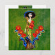 Doré et bleu antique Catrina sur une surface verte délavée. La figure est stylisée et élégante, avec une robe aux nuances dorées et un volant bleu qui s'étend sur les côtés. Elle porte un chapeau orné élégant également en bleu de cobalt. Dans ses bras, elle porte un beau bouquet de fleurs rouges. Célébrez Dia de los Muertos ou Jour des Morts avec ce design boho inspiré de l'art mexicain.