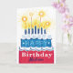 Des étoiles et des rayures décorent la glace sur un gâteau d'anniversaire 2 couches rouge, blanc et bleu avec des bougies et des lustres sur le dessus. Express tes souhaits heureux et le rendre personnel en customisant le nom. ©Mindy Pierce