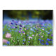 Un champ de fleurs de maïs dans les tons bleu profond et pâle, violet, lavande et rose, avec des feuilles vert pâle.