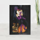 Sorcière blonde assise sur un grand citrouille orange. A ses côtés se trouve un chat noir sur une pile de livres. Derrière se trouve une forêt et un château.
