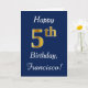 Ce simple design de carte d'anniversaire comporte le message "Joyeux 5ème anniversaire", avec le "5ème" ayant une apparence fausse or. Il porte également un nom personnalisé et un arrière - plan bleu foncé. On pourrait le donner à quelqu'un qui célèbre son cinquième anniversaire.