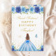 Cette carte d'anniversaire élégante et glamour en sweet sixteen peut être personnalisée avec un nom ou un titre comme fille, petite-fille, nièce, ami etc. Le design présente une belle princesse aux cheveux roux brun et à la peau claire dans une robe bleue. Le texte combine écriture manuscrite et polices sans serif modernes pour un look élégant et sophistiqué. Les compositions florales, les papillons et les confettis d'or créent un mélange parfait de rustique et de chic. Graphiques par www.etsy.com/uk/shop/SunflowerDayLove
