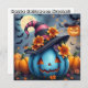 A cute blue pumpkin in a witches hate with orange flowers Halloween card that can be personalized with a name. Also the back is a cute coloring page!