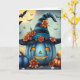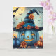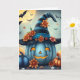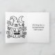 A cute blue and black pumpkin with striped witches hat with a bat and full moon background Halloween card with an inside coloring page.