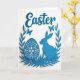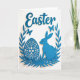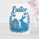 This design shows a long-eared bunny nestled beside an ornate egg, both shown in a rich cerulean blue that feels calm and affectionate 🐰. Curving leafy fronds rise from the bottom and wrap upward like a gentle embrace, giving the scene a cozy, close-together look. Near the top center, the word “Easter” appears in flowing blue lettering, spaced above the main illustration so it feels airy rather than crowded 🌷. The artwork has a cut-out, layered look against a bright white background, with soft shadows that make each shape seem slightly lifted. Two small winged insects hover in the upper left and upper right, adding a light, flirty sense of motion around the couple-like pairing below. The egg is filled with delicate floral and geometric details, while the bunny’s smooth silhouette leans toward it as if sharing a quiet moment. All elements stay within the same blue tone, from the leaves to the insects, creating a unified scene. The white space around the wreath-like framing and the pale shadows under each piece keep the composition crisp and airy.