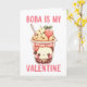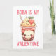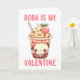 Un petit visage mignon à l'intérieur d'une tasse de thé à bulles rose avec une paille dit, Boba est mon Valentin. L'intérieur est vierge pour que vous puissiez écrire à la main le message parfait.