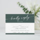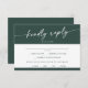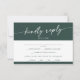 Cette carte rsvp chic boho vert émeraude au choix est parfaite pour un mariage minimaliste. Le design bohème moderne et moderne de la forêt de chasseurs, sombre et maussade, se compose d'une calligraphie rustique simple au style unique mais classique. Inclure les options de repas pour votre réception sur la carte de l'enceinte.