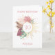 Carte d'anniversaire boho tendance que vous pouvez personnaliser pour tout âge et nom. Le design comprend de l'aquarelle pampas herbe, eucalyptus feuilles, feuillage et éclaboussures avec un mandala de soleil doré, rayonnant l'amour et la lumière. Le modèle est configuré pour ajouter n'importe quel âge et n'importe quel nom ; vous pouvez également modifier le message à l'intérieur.