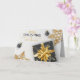 Élégant design de vacances de haute qualité avec des flocons de neige en paillettes dorées glamour, des boules d'arbre de Noël noires et une boîte cadeau noire sur un fond gris clair. Cette salutation saisonnière festive est parfaite pour votre petite entreprise ou pour offrir à vos amis et à votre famille.
