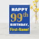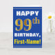 This simple birthday-themed greeting card design objets a warm birthday wish like "HAPPY 99th BIRTHDAY, First-Name!" on the front, bold text on a blue colored background. The birthday number has a faux/imitation gold-like coloring look. Le nom du front can be customized. The inside feobjets a birthday that can be customized. A greeting card like this could be a fun way to deliver birthday wishes to somebody who is celebrating their ninety nintthday birthday. [ Z000278]