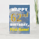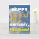 Ce simple design de carte de voeux sur le thème de l'anniversaire présente un voeu d'anniversaire chaleureux comme "HAPPY 62nd BIRTHDAY, First-Name!" sur le devant, en texte gras sur un arrière - plan représentant un ciel bleu avec des nuages blancs et gris. Le numéro d'anniversaire a un look de couleur imitation or. Le nom sur le devant peut être personnalisé. L'intérieur comporte un message d'anniversaire qui peut être customisé. Une carte de voeux comme celle-ci pourrait être une façon amusante d'offrir des voeux d'anniversaire à quelqu'un qui célèbre son soixante-deuxième anniversaire. [~Z0000284]