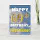 Ce simple design de carte de voeux sur le thème de l'anniversaire présente un voeu d'anniversaire chaleureux comme "HEUREUX 69ème anniversaire, prénom!" sur le devant, en texte gras sur un arrière - plan représentant un ciel bleu avec des nuages blancs et gris. Le numéro d'anniversaire a un look de couleur imitation or. Le nom sur le devant peut être personnalisé. L'intérieur comporte un message d'anniversaire qui peut être personnalisé. Une carte de voeux comme celle-ci pourrait être une façon amusante d'offrir des voeux d'anniversaire à quelqu'un qui célèbre son soixante-neuvième anniversaire. [~Z0000284]