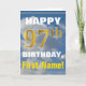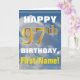 Ce simple design de carte de voeux sur le thème de l'anniversaire présente un voeu d'anniversaire chaleureux comme "HEUREUX 97ème anniversaire, prénom!" sur le devant, en texte gras sur un arrière - plan représentant un ciel bleu avec des nuages blancs et gris. Le numéro d'anniversaire a une apparence de coloration fausse/imitation or. Le nom sur le devant peut être personnalisé. L'intérieur comporte un message d'anniversaire personnalisable. Une carte de voeux comme celle-ci pourrait être une façon amusante d'offrir des voeux d'anniversaire à quelqu'un qui célèbre son quatre-vingt-dix-septième anniversaire. [~Z0000284]