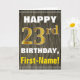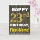 Ce simple design de carte de voeux sur le thème de l'anniversaire présente un voeu d'anniversaire chaleureux comme "HAPPY 23rd BIRTHDAY, First-Name!" sur le devant, en texte gras sur un faux motif d'apparence en bois arrière - plan. Le numéro d'anniversaire a une apparence de coloration fausse/imitation or. Le nom sur le devant peut être personnalisé. L'intérieur comporte un message d'anniversaire personnalisable. Une carte de voeux comme celle-ci pourrait être une façon amusante d'offrir des voeux d'anniversaire à quelqu'un qui célèbre son vingt-troisième anniversaire. [~Z0000280]