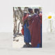 Des bébés et les jeunes ceux sont portés sur le dos de leur mère comme montré ici dans un village typique de Maasai en Tanzanie, Afrique. Hommes et vêtements pour femmes rouges et tissu bleu enroulé autour de leurs corps pour l'habillement.