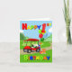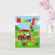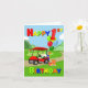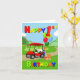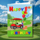 Zoom sur la scène d'anniversaire, une voiturette de golf rouge vif apporte excitation et joie! À l'avant se trouve un gâteau festif sur le thème du golf, tandis que le dos est empilé de cadeaux colorés et de ballons surmontés d'un ballon géant numéro 1. Avec un texte en gras de couleur primaire, cette carte est parfaite pour célébrer la journée spéciale d’un petit garçon.