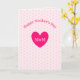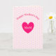 Bonne carte de fête des mères avec un grand coeur et le mot MOM au centre sur un arrière - plan rose clair avec motif de coeur rose. Les textes à l'intérieur de la carte peuvent être customisés.