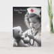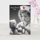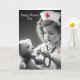 Une jeune fille aux cheveux bouclés et casquette d'une infirmière utilise un stéthoscope pour vérifier le battement de coeur d'un ours en peluche. Tout le texte peut être modifié.