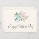 Carte de fête des mères avec une jolie illustration aquarelle. Un bouquet de fleurs avec des fleurs roses et bleues entourées de feuilles vertes et de brindilles.