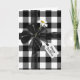 Arbalète en cuir noir avec diaspora blanche et étiquette cadeau sur le bison blanc et noir plaid. Le texte de Joyeux Anniversaire est modifiable.