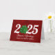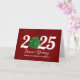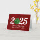 Arc cadeau vert sur arrière - plan rouge enneigé pour 2025 Bonnes Fêtes. Le nom de la famille peut être supprimé ou modifié.