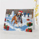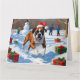 Illustration de vacances pleine de charme avec un chien gai jouant dans la neige, portant un chapeau de Père Noël et entouré de boîtes cadeaux colorées. Dans l'arrière - plan, les enfants construisent un bonhomme de neige à côté d'un sapin de Noël enneigé, créant un merveilleux pays hivernal. Parfait pour répandre la joie des fêtes et capturer la magie de Noël.