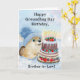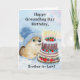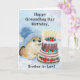 This hand-painted watercolor and pen illustration features a cute groundhog peeking out of his den as he reaches for a chocolate and vanilla cake topped with strawberries, blueberries, and boysenberries. A funny card for a brother-in-law!