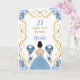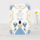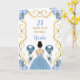 Cette invitation à la carte d'anniversaire comprend un cadre doré élégant, une belle princesse aux cheveux bruns et une robe bleue poussiéreuse, des fleurs et un ballon.