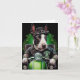 Un ami à fourrure derrière le guidon d'un vélo vert brillant, portant une tenue de Saint-Patrick verte qui fait tourner les têtes. Le chien est vêtu d'une tenue de fête, avec un nœud papillon vert et un haut-de-forme assorti qui repose confortablement sur sa tête. La tenue présente des motifs complexes de trèfles et de lutins, ce qui montre clairement que ce chien est prêt à célébrer la Saint-Patrick dans le style.