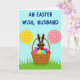 This card shows a friendly brown bunny 🐰 with wide, gentle eyes and a small red bow tie, peeking out of a woven basket as if it’s leaning in for a sweet hello. The basket is packed with decorated eggs in bright mixes of patterns, including magenta stripes, sunny yellow dots, and calm aqua bands, arranged like a shared treat between close friends. On either side, two oversized spiral candies curl upward—one golden yellow and the other soft pastel pink—framing the bunny like a cheerful pair standing close together. The background is a smooth sky-blue field that sets a light spring mood, while a strip of stylized green grass runs along the bottom like a simple meadow 🌷. Across the top, a curving greeting is placed prominently in deep cerulean blue, standing out clearly against the blue sky. The letters arc over the scene like a banner, guiding your eye down toward the bunny and its basket. The overall look uses flat areas of color and crisp outlines, with the pink and yellow candy swirls echoing the egg decorations. At the base, the green grass forms a neat band beneath the basket, with the eggs’ patterns and the two spiral candies balancing the composition.