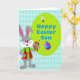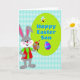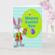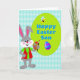 Designed with a flat, graphic look, this Easter card features a friendly grey rabbit on the left, with pink-lined ears, a wide smile, and two front teeth showing 🐰. The rabbit wears a green shirt under red overalls and holds a painter’s palette and a thin brush, as if making something sweet for a close friend. On the right, a lime-green oval frames the main message, set in large blue letters near the top of the oval. Beneath the lettering sits a single decorated egg with purple and blue stripes, adding a gentle spring touch 🌷. Above the words, a small striped winged insect floats in place, its light blue wings drawn as translucent shapes. The background is aqua with a repeating diamond pattern that keeps the scene soft and calm. The lime-green oval, blue text, striped egg, and tiny insect stand out against the pale aqua diamonds.