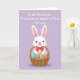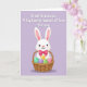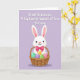 This card shows a fluffy white rabbit character centered on the front, drawn with soft rounded shapes and a gentle, welcoming smile 🐰. A bright pink bow tie sits at its neck, adding a sweet, dressed-up touch that feels like a friendly hug in picture form. The rabbit holds a light brown woven basket close to its chest, as if carefully offering it to someone special. Inside the basket are several decorated eggs in pastel green, purple, yellow, and pink, each finished with simple stripe patterns that suggest careful attention and affection. The background is a solid lavender field that keeps the focus on the rabbit and basket while giving the scene a calm springtime look 🌷. Across the top, the message “Great Grandson, A big Easter basket of love for you” is set in rounded white lettering, centered above the character. The lighting is soft with very little shadow, keeping the shapes gentle and the mood tender and friendly. The basket’s curved handle arches over the eggs, with the pastel stripes clearly visible against the warm brown weave.