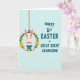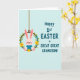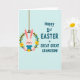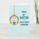 This card features a light pink bunny in a soft blue outfit, sitting cozily inside a green floral wreath with a gentle, affectionate look that feels like a family cuddle 🐰. The bunny’s long ears tilt slightly upward, with a tiny red nose and rosy cheeks that add a tender, friendly charm. The wreath is made from a brown vine ring and decorated with small yellow and pale blue flowers, tucked among leafy green sprigs like a springtime keepsake 🌷. A thin brown hanging cord at the top makes the wreath look suspended, as if it’s swaying lightly in the air. On the right side, teal lettering in large, easy-to-read capitals says “Happy 1st EASTER GREAT GREAT GRANDSON!” stacked across several lines. The text sits against a pale blue background with faint diagonal line texture, giving the layout a calm, airy feel beside the warmer pink and sunny yellow details. The bunny and wreath occupy the left half while the teal message fills the right, and the background remains softly patterned with diagonal stripes.
