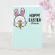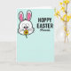 This design shows a stylized white rabbit head in the upper-left on a light aqua background, outlined in black with wide-set eyes that look gently toward the message as if sharing a quiet hello 🐰. Its long ears stand upright with soft pink interiors, and a yellow daisy-like flower with a red center rests in its mouth like a small gift between friends 🌷. The backdrop has a subtle pattern of dashed white lines arranged in a faint grid, giving the scene a tidy, springtime feel. On the right side, large black sans-serif text reads “HOPPY EASTER,” taking up most of the open space and balancing the rabbit’s face. Beneath that, the word “Parents” appears in a flowing, connected cursive style in black, placed lower and slightly smaller. The spacing between the rabbit and the lettering leaves a calm, airy gap that feels like room for a warm glance to travel across the card. The slender green stem angles downward from the rabbit’s mouth, with the bright flower head tilted slightly forward.