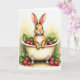 This card features a young, long-eared bunny 🐰 with soft fawn-colored fur and wide, dark eyes framed by fine lashes, giving it a tender, friendly look. The bunny peeks out from a cream-colored basin, as if it’s shyly meeting someone across the table. The basin has an old-fashioned feel with curved sides and small claw-like feet that add a gentle antique touch. Clusters of deep red berries and fresh green leaves spill inside the basin and tumble around its base, like a shared garden find meant for two. Behind the scene, pale greens and soft yellows blur together in a light spring setting, keeping the focus on the bunny and the fruit. A short Easter greeting appears near the top in a soft, warm color, with a smaller line of text placed below in a darker shade for contrast, and a tiny 🌷 tucked beside the words. Dewy highlights shine on the berries, and the cream basin sits on curled feet with berries scattered along the lower edge.