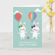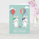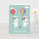 This greeting card shows two white rabbit-like figures facing forward in a balanced layout, their rounded cheeks lightly blushed as if they’re sharing a shy, affectionate moment 🐰. The background is a soft blue-green wash, with tiny white specks drifting around them like gentle confetti. The left bunny wears a bright green bow and lifts a balloon split into light blue with red polka dots, while the right bunny wears a deep navy bow and holds a balloon with vertical rainbow stripes 🐇. Two pale, cloud-shaped forms float near the top, framing the pair without crowding them. Centered below the bunnies sits a single red heart, anchoring the scene like a quiet sign of closeness. Along the bottom edge, the message “Some bunny loves you, SWEET LITTLE BUNNY” is set in a flowing handwritten look, with the main line in dark lettering and the emphasized phrase in uppercase. The balloons rise above their ears, with thin strings trailing down toward their paws against the blue-green backdrop.