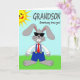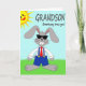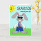 This greeting card features an upright gray bunny 🐰 centered on a strip of green grass beneath a bright blue sky, giving the scene an easy, sunny feel. The bunny wears dark rectangular glasses, a white shirt, blue overalls with yellow buttons, and a red tie, and its big front teeth add a friendly, slightly bashful charm. A smiling yellow sun with radiating rays sits near the upper left, as if beaming down on the bunny like a cheerful companion. Near the top, the main line of text is set large and easy to read, with the pun phrase “Somebunny loves you!” placed prominently across the upper area in a dark, high-contrast color. The bunny’s upright pose and neat outfit suggest it dressed up just to impress someone special 🐇. Simple shapes and solid areas of color keep the focus on the tender, lighthearted mood between the viewer and the bunny’s affectionate message. The background stays uncluttered, with the sun’s rays fanning outward and the green grass forming a single band along the bottom edge.