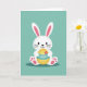 This design shows a white, bunny-like character centered on a smooth teal background, looking straight ahead with a gentle, friendly gaze 🐰. Its long ears stand upright with soft pink inner details, matching the pink pads on its oversized feet, and thin whiskers frame a tiny nose. The character’s arms wrap around a large egg-shaped decoration as if holding it close like a small gift for someone special. The egg is striped in warm golden yellow and light aqua, with the aqua tones tying back to the background for a calm, cozy look. Near the top area, simple Easter greeting text sits in a neat line, set in white so it stands out clearly against the teal. A small fuchsia flower with a yellow center rests on one aqua stripe, adding a sweet, affectionate touch 🌷. A soft shadow sits directly beneath the character, anchoring it to the surface while the teal backdrop remains smooth and untextured.