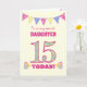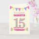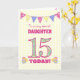 Une jolie carte d'anniversaire pour votre fille de 15 ans, avec un décor de fanions à pois, des fleurs de primevère et des chiffres remplis d'un motif de primevère, le tout sur un fond à carreaux jaune pâle. Le message sur la couverture est 'À une fille très spéciale 15 AUJOURD'HUI !'. Le message à l'intérieur est juste une suggestion et vous pouvez facilement le personnaliser ou le supprimer si vous préférez.